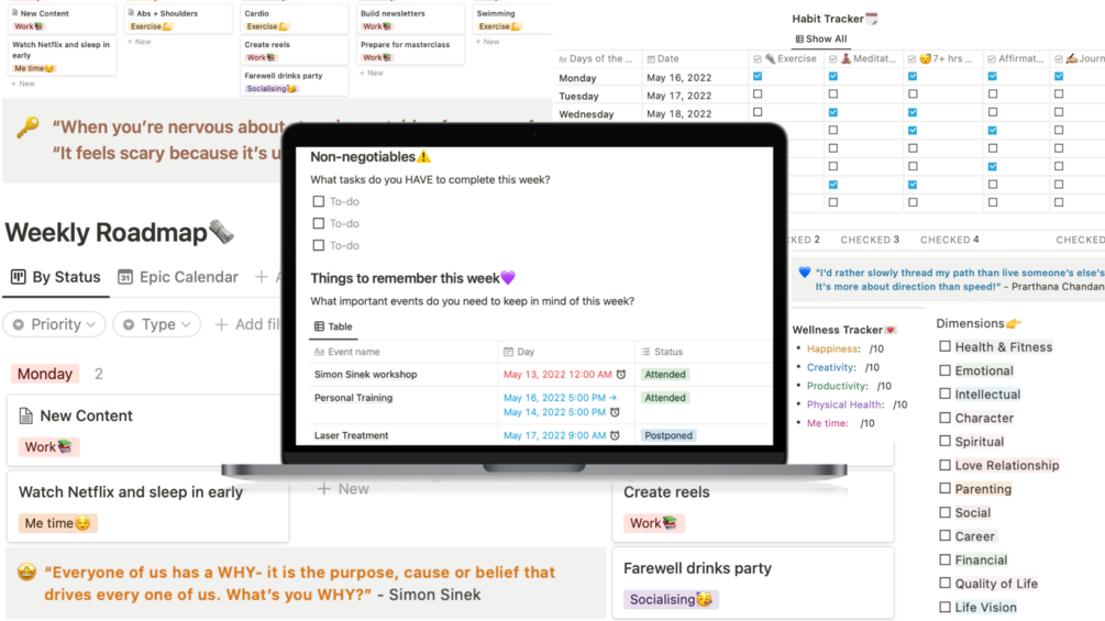 This template will help you keep a holistic track of progress on your intentional goals and day to day activities while keeping you motivated after every sub-tracker with inspiring and soul-led quotes!⚡️It also incorporates prioritisation features so you can time manage better and increase your efficiency and speed in the RIGHT direction!